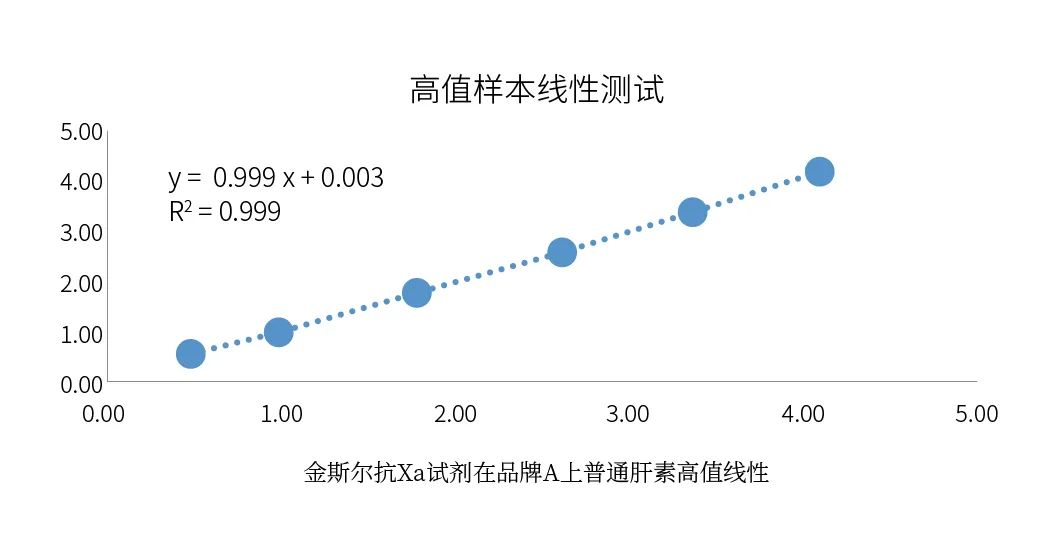 (2)國產(chǎn)抗Xa試劑可以滿足臨床預(yù)期用途:九強抗Xa試劑盒普通肝素線性可以做到4IU/mL,不僅可以滿足說明書所宣稱的1.2IU/mL,同時可以滿足臨床上的一些異常特殊高值樣本的檢測需求;