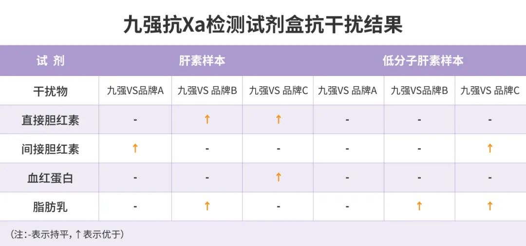 九強(qiáng)生物抗Xa檢測(cè)試劑盒多中心驗(yàn)證數(shù)據(jù)顯示:九強(qiáng)抗Xa檢測(cè)試劑盒抗干擾能力優(yōu)于進(jìn)口主流廠家配套試劑。九強(qiáng)試劑檢測(cè)普通肝素/低分子肝素樣本時(shí),干擾物濃度低于以下濃度(直接膽紅素20mg/dl,間接膽紅素10mg/ml,血紅蛋白500mg/dl,脂肪乳400mg/dl)時(shí)無(wú)顯著干擾,回收率在90-110%。